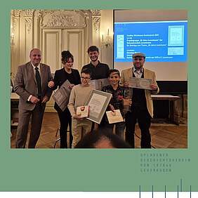 Mit einem Sonderpreis zu 50 Jahren Leverkusen zeichnet der OGV eine Projektgruppe der Sekundarschule Leverkusen aus. Laudator und OGV-Geschichtswart Christian Drach lobte die Schülergruppe und ihre beiden Lehrer Laura Michaelis und Tim Hoenings für den musikalisch untermalten Film, für den sie zentrale Orte der Leverkusener Stadtgeschichte wie das ehemalige Eisenbahnausbesserungswerk oder den Japanischen Garten besuchten, in der Opladener Fußgängerzone Passanten und beim Fußballtraining von Bayer 04 Fußballprofis zur Historie Leverkusens befragten.