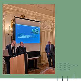 Anschließend diskutierte Mittag mit Guido von Büren, Vorsitzender des Jülicher Geschichtsvereins und Prof. Dr. Wolfgang Hasberg, Vorsitzender der Wissenschaftlichen Kommission des OGV, über den Stellenwert und die Perspektiven der lokalen Geschichtsarbeit, wie der OGV sie betreibt. Hasberg betonte dabei, wie wichtig eine stärkere Institutionalisierung für die Zukunft dieser ehrenamtlichen Arbeit wäre und warb für das OGV-Konzept eines stadthistorischen Zentrums.