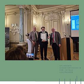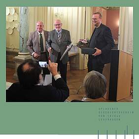 Schließlich ehrten Michael Gutbier und der OGV-Ehrenvorsitzende Ernst Küchler Bernhard Marewski mit dem Liedtke-Wichmann-Ehrenpreis. Der jahrzehntelang in der Leverkusener Kommunalpolitik engagierte Schlebuscher hat die Aktivitäten des OGV stets mit großem Wohlwollen und starkem historischem Interesse begleitet. Zudem hat sich Marewski für die europäischen Verbindungen Leverkusens, insbesondere zur finnischen Partnerstadt Oulu, eingesetzt. Er ist Vorsitzender der Deutsch-Finnischen-Gesellschaft Leverkusen. „Für dieses Wirken, für Ihr jahrzehntelanges Engagement für Stadtgeschichte, Kultur und Bürgersinn“ zeichne ihn der OGV aus, so Gutbier. Zugleich verlieh der OGV Marewski die Ehrenmitgliedschaft.